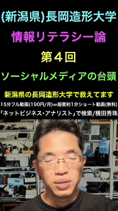 ネットビジネス・アナリストの横田秀珠氏による長岡造形大学の情報リテラシー論第4回講義。ソーシャルメディアの変遷について解説。日本のSNSは巣移り現象があり、Facebook、Twitter、Instagramへと移行。世界ではFacebookが最大。SNSとブログの違い、noteの台頭、AI生成コンテンツの増加とその問題点、リアルとAIの住み分けの必要性などを議論。学生からの質問に答える形で、SNS時代の情報発信やリテラシーについて解説している。