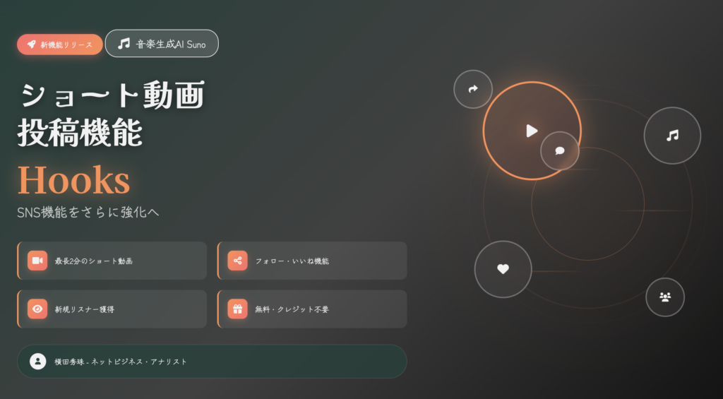 音楽生成AI「Suno」に、ショート動画投稿機能「Hooks(フック)」が追加されました。これは単なる機能追加ではありません。音楽を作る人と聴く人をつなぐ、まったく新しいコミュニケーションの形が生まれたのです。