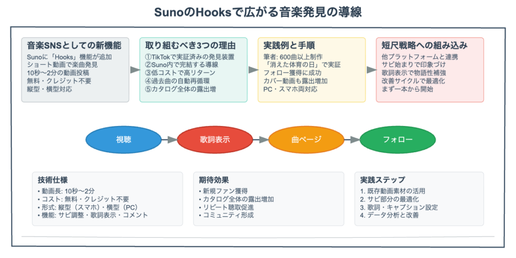 私は600本以上の楽曲をSunoで制作し、「SunoP」として音楽イベントにも出演してきました。だからこそ、この新機能の革命的な意味と、その具体的な活用方法を日本語で詳しく解説する必要があると感じています。本記事では、Hooksの全貌から実際の使い方、そして成功のコツまで、徹底的にお伝えしていきます。