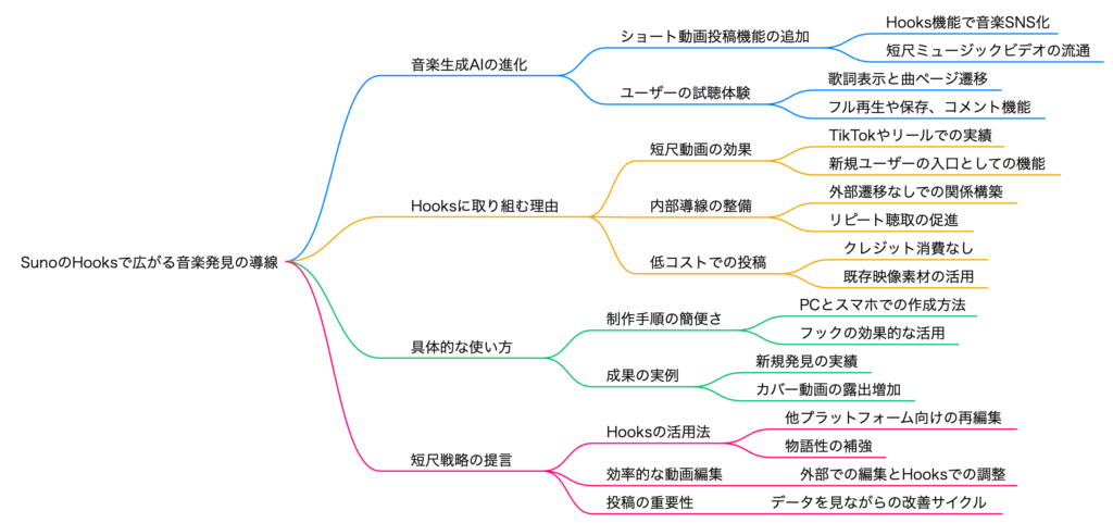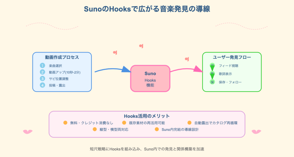 Hooksは収益化のファネルの頂点となり、**Hook(発見)→ フル尺トラック再生(消費)→ 外部ストリーミング/ダウンロード(収益)**という流れを形成します 。