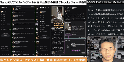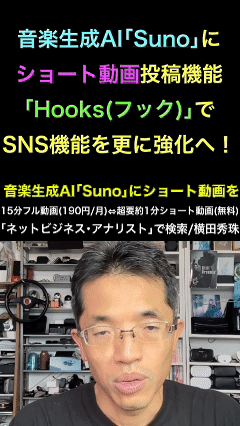 音楽生成AI「Suno」に新機能「Hooks(フック)」が追加された。これはショート動画投稿機能で、自作の動画に音楽を組み合わせて投稿できる。TikTokのような縦型動画形式で、10秒から2分まで対応。無料で作成でき、クレジットも不要。フックをきっかけに新規フォロワーが増える効果があり、SNSとしての機能が強化された。過去の楽曲のカバー写真も動画化でき、フィードに自動表示される。生成AIがSNSになる時代の到来を示す重要なアップデートである。