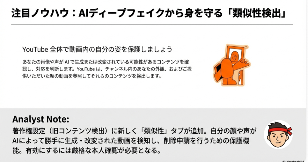 • コンテンツ検出の進化: 従来の著作権管理は「コンテンツ検出」へと統合され、AIによる「類似性検出」で顔や音声の不正利用を自動特定する体制が整いました。