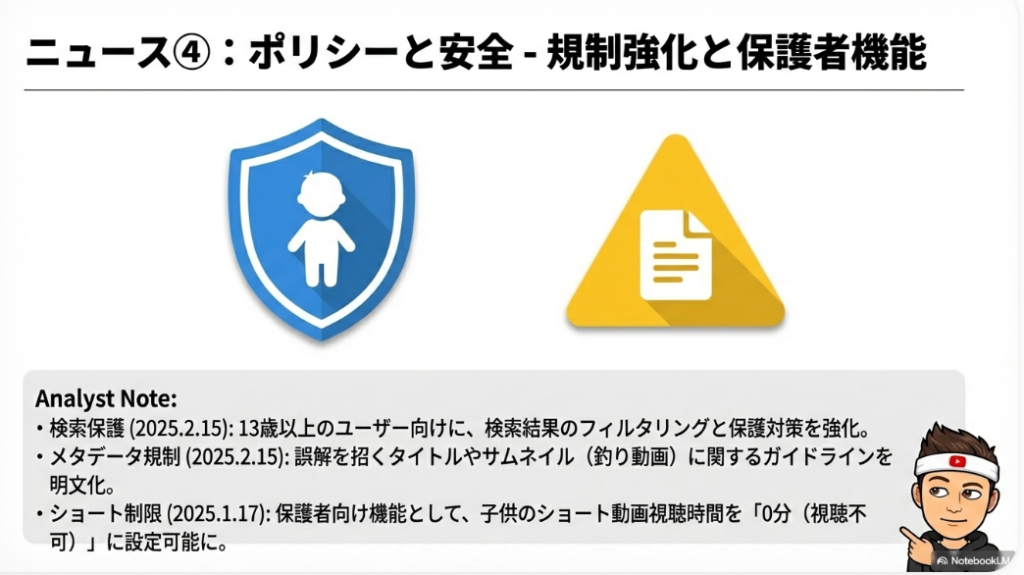 👶 子ども向け保護機能 YouTubeが強化している未成年者保護の取り組み。13歳以上向けの検索保護対策の導入に加え、保護者がショート動画の視聴時間を0分に設定できる機能も追加された。子どもが有害コンテンツに触れるリスクを軽減し、保護者がより細かく視聴環境をコントロールできるようにする方針が進んでいる。