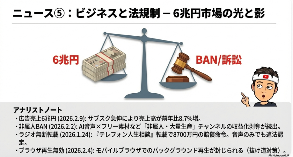 🚫 非属人チャンネルBAN 顔出しなし・AI音声・大量生産という「非属人」スタイルのチャンネルが収益化剥奪や削除される事例が続出している問題。VTuberのように人格が見えるものは問題ないが、人間の存在感がまったくないコンテンツはYouTubeの方針に反するとして厳しく取り締まられる傾向が強まっている。
