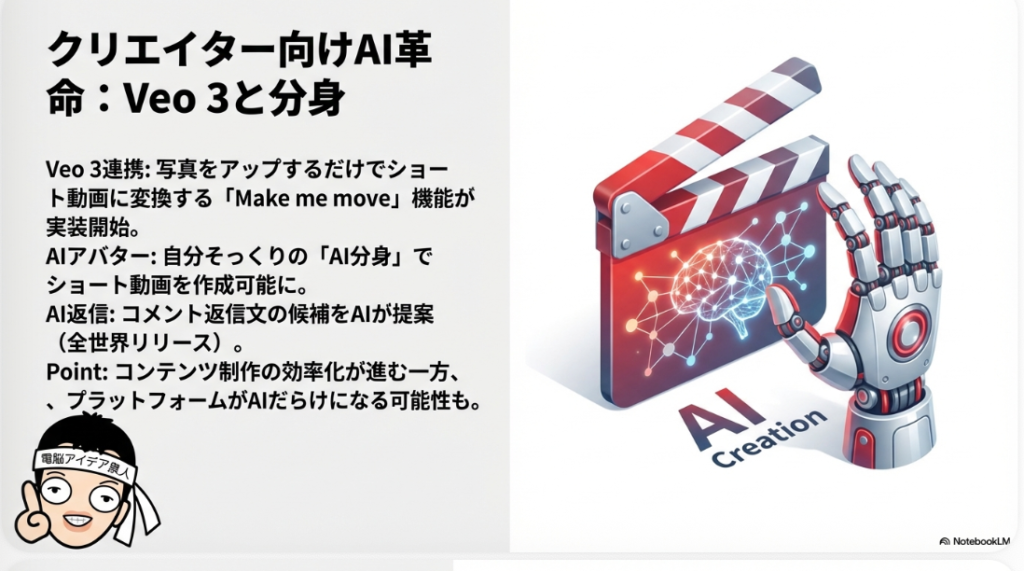 🤖 Veo 3 Googleが開発した動画生成AIモデル。写真を貼り付けるだけでショート動画に変換できる機能が一部ユーザーに実装され始めた。自分そっくりのAI分身でショート動画を制作できる機能にも関連しており、AI生成コンテンツの急増が予想されるが、フェイク動画の拡散リスクも懸念されている。