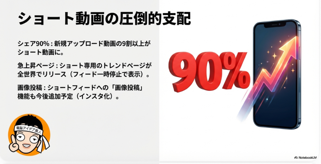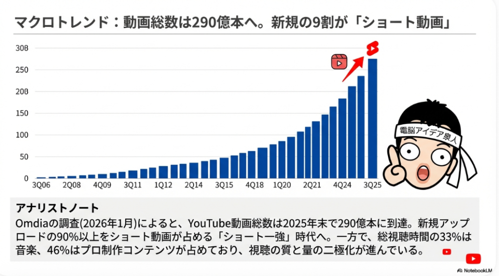 最新の市場データ(2026年2月15日時点)によると、YouTube上の累計動画数は290億本を突破しました。特筆すべきは、2025年の10ヶ月間だけで全動画の25%が投稿されたという供給の加速度です。現在、新規アップロードの90%以上はショート動画が占めており、プラットフォームはかつてない情報の波にさらされています。