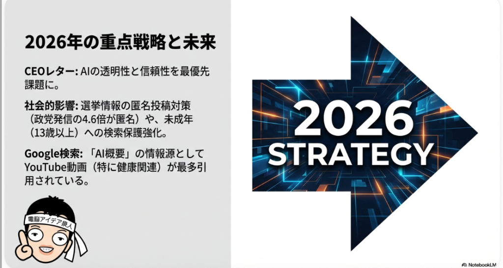 • 匿名性のリスク: 2026年の衆議院選挙において、YouTube再生数の7割が匿名投稿によるもので、政党公式の4.6倍に達したというデータがあります。プラットフォーム側は世論操作への警戒から、今後さらに発信者の透明性を求める規制を強めるでしょう。