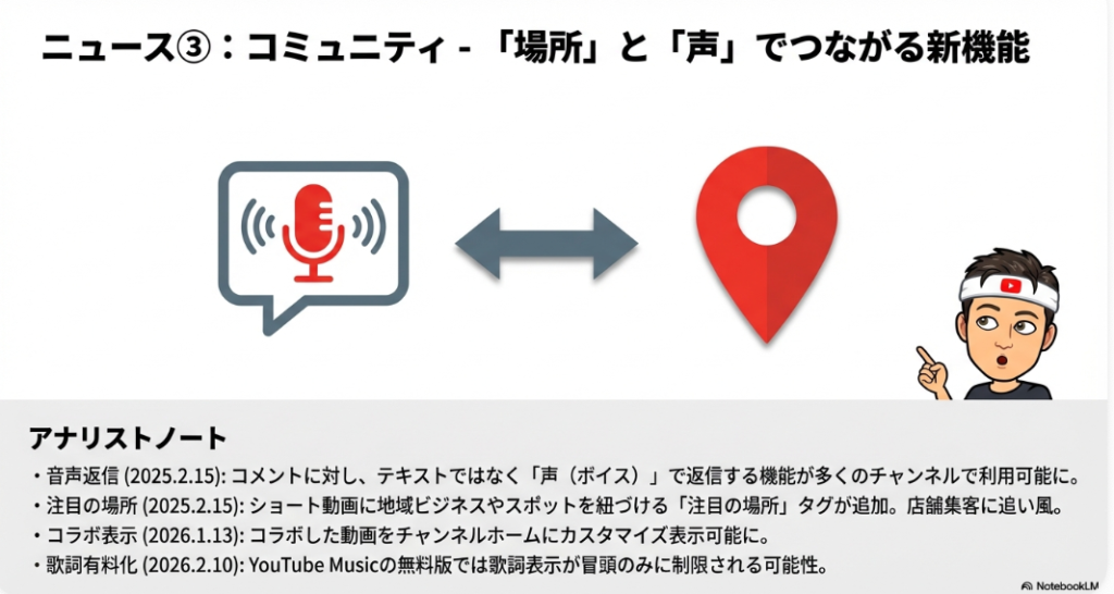 🎙️ 音声返信機能 YouTubeのコメント欄でテキストではなく音声ボイスで返信できる機能。対応チャンネルが拡大中で、文字入力の手間を省きつつ、視聴者に対してより親密で人間味のあるコミュニケーションが可能になる。AI音声入力の普及とも相まって、クリエイターと視聴者の距離を縮める新しい交流手段として注目される。