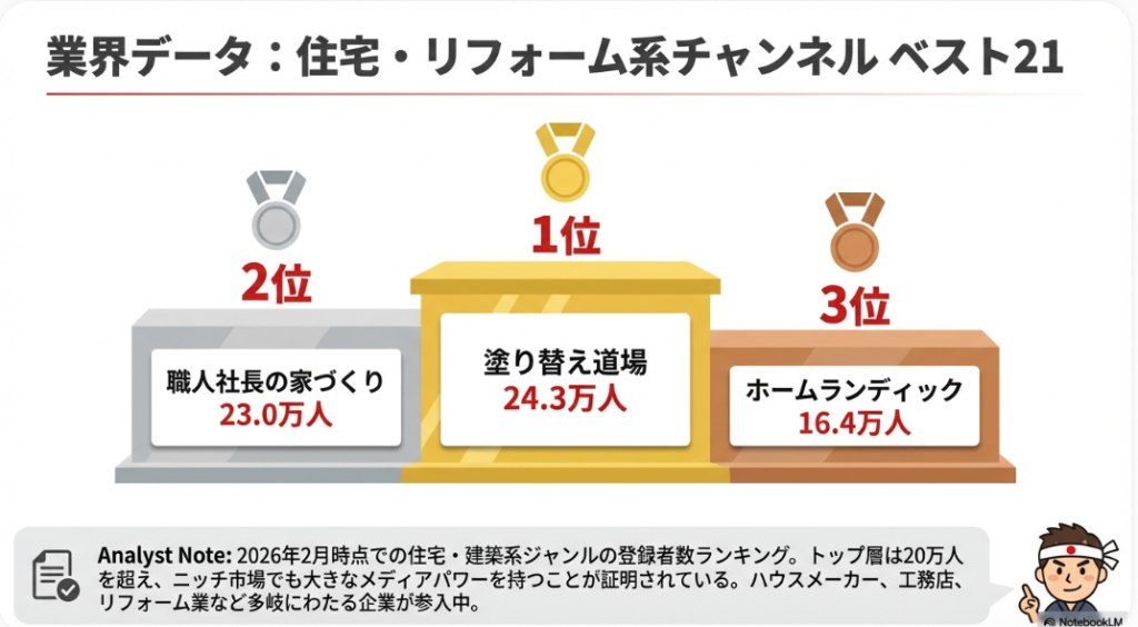 追加ニュース:住宅建築リフォーム系YouTubeチャンネル登録者数ランキングベスト21