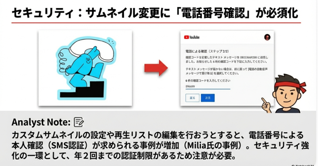 1. AI活用の最適化と本人確認の徹底: 制作工程にVeo等の生成AIを導入してコストを削減する一方、カスタムサムネイル設定や再生リストの有効化に必要な「SMS本人確認」および「2段階認証」を完遂し、アカウントの信頼スコアを最大化する。