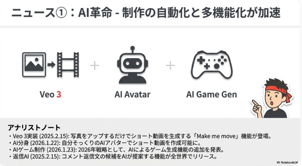 3. インタラクティブ機能への投資: Apple Vision Pro向け公式アプリのリリースや「AIゲーム制作機能」の実装など、YouTubeが提示する「体験型コンテンツ」への対応準備を開始する。