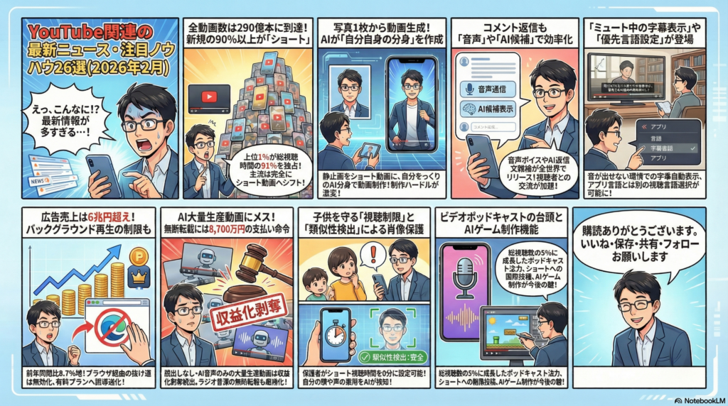 0:00 👋 導入・チャンネル成績報告 1:08 📢 ブログ紹介・メンバーシップ案内 2:13 🎤 AIシンガー「Milia」チャンネル開設 2:50 🤖 Veo3で写真→ショート動画変換機能 3:14 🌐 動画視聴の優先言語選択機能 3:30 🔥 ショート動画の急上昇ページ全世界リリース 3:50 🔇 ミュート中の字幕表示設定が追加 4:21 🎙️ 音声返信機能が多くのチャンネルで利用可能に 4:45 🧒 13歳以上向け検索保護対策の導入 5:00 📐 ショート動画が横画面でも視聴可能に(iOS限定) 5:35 💬 AIを活用したコメント文の表示機能 6:00 ⚠️ 誤解を招くメタデータのガイドライン明文化 6:26 📍 ショート動画に「注目の場所」機能追加 6:45 🥽 Apple Vision Pro向け公式アプリリリース 6:56 🎵 YouTube Music 歌詞表示の有料化 7:30 💰 YouTube広告売上高が6兆円超え 7:45 🚫 ブラウザでのバックグラウンド再生が無効化 8:05 🤔 高市動画の異常な再生数(約9000万回)に疑問 8:34 🗳️ 衆議院選挙YouTube再生数の7割が匿名投稿 9:00 🔨 AI非属人コンテンツ大量生産への収益化剥奪 9:42 📊 YouTube動画本数290億本・9割がショート動画 10:00 🔍 Google AI概要の情報源にYouTubeが活用 10:15 ⚖️ テレホン人生相談の無断転載で8700万円支払い命令 10:44 🧑🤝🧑 AI分身でショート動画を作る機能 10:55 🎯 YouTube 2026年重点戦略発表 11:48 🏠 住宅建築リフォーム系チャンネルランキング紹介 12:51 🎧 ビデオポッドキャストの伸び 13:10 🔎 著作権タブが「コンテンツ検出」に名称変更・類似性機能追加 13:53 🔐 サムネイル・再生リスト設定に本人確認が必要に 14:30 👋 まとめ・締めの挨拶
