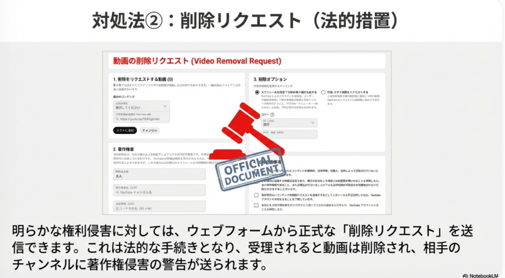 著作権タブで自分のコンテンツと類似する動画を発見した際、YouTubeは複数の対応手段を用意している。その中でも特に重要なのが「削除リクエスト」と「メッセージ」の2つの機能だ。これらを適切に活用することで、著作権侵害コンテンツに対して正式な申し立てを行うことができる。