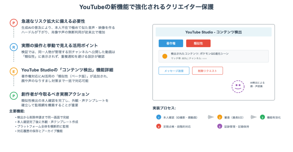 YouTubeの「コンテンツ検出」機能、特にAI時代の肖像保護を担う「類似性(ベータ版)」の活用は、もはやオプションではなく、企業広報・法務における標準装備です。