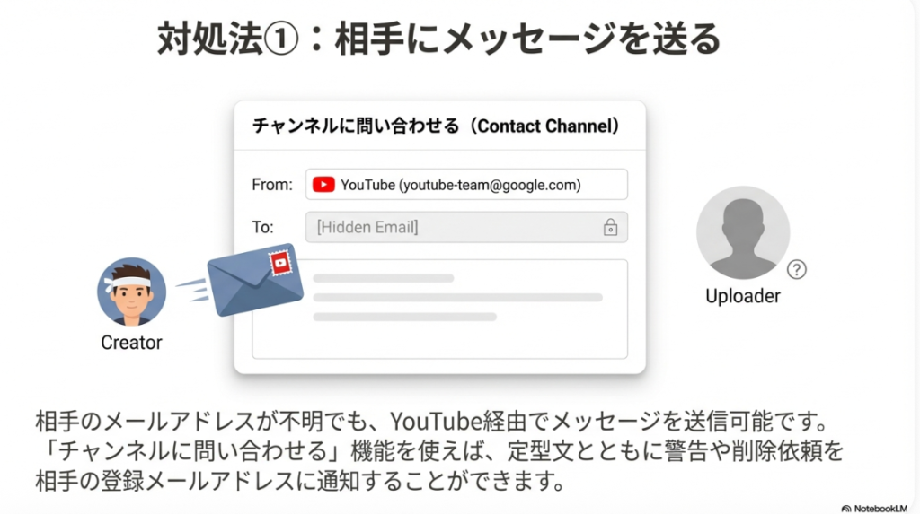 「メッセージ」機能は、削除リクエストとは別に相手チャンネルに対して直接メッセージを送ることができる機能だ。送信されるメッセージには対象動画のタイトルが件名として自動入力され、YouTube経由で登録メールアドレスへ届く仕組みになっている。まずは「同じコンテンツが使用されているようなので確認をお願いしたい」といった穏やかな連絡から始め、対応がなければ削除リクエストへエスカレーションするという段階的な対応が現実的だ。これらの機能の存在はあまり知られていないが、チャンネル保護の観点から積極的に活用すべきツールと言える。