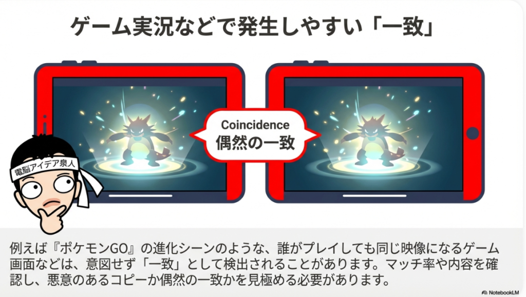 ソースコンテキストにある「ポケモンGO」の事例は、示唆に富んでいます。ゲームの進化シーンのような「共通アセット」は、誰が撮影しても類似します。こうした意図しない一致にリソースを割くのは非効率です。