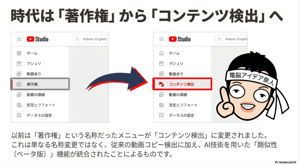 YouTube Studioの管理画面をよく利用しているクリエイターは、ある日を境に左側メニューの名称が変わっていることに気づいただろう。以前は「著作権」と表示されていたメニュー項目が、現在では「コンテンツ検出」という名称に刷新されている。この変更は単なるリネームではなく、YouTubeが提供するコンテンツ保護機能そのものが大幅に拡張されたことを象徴している。
