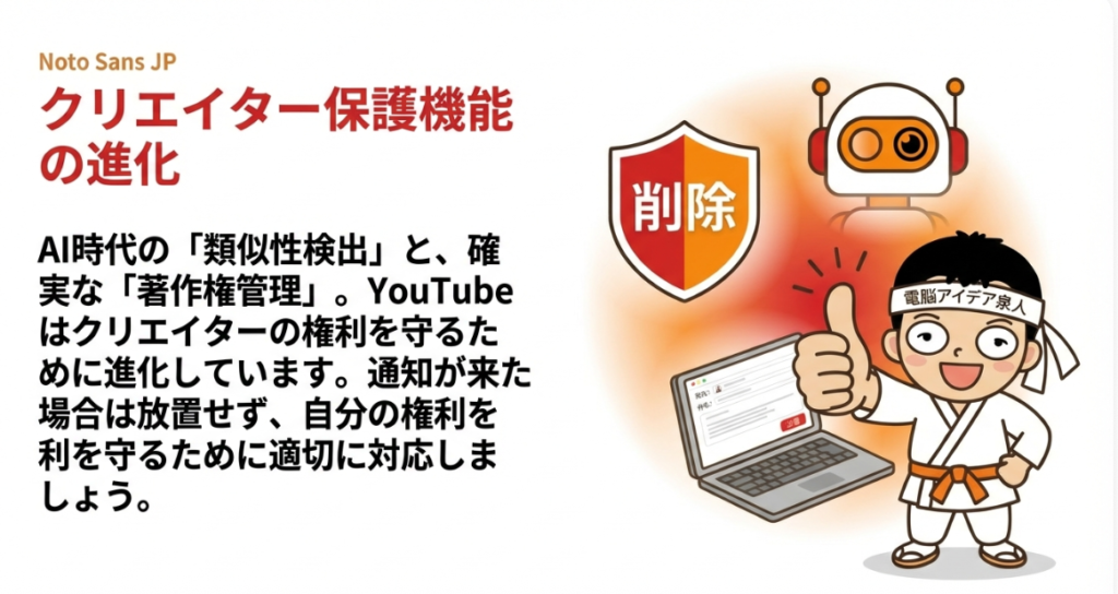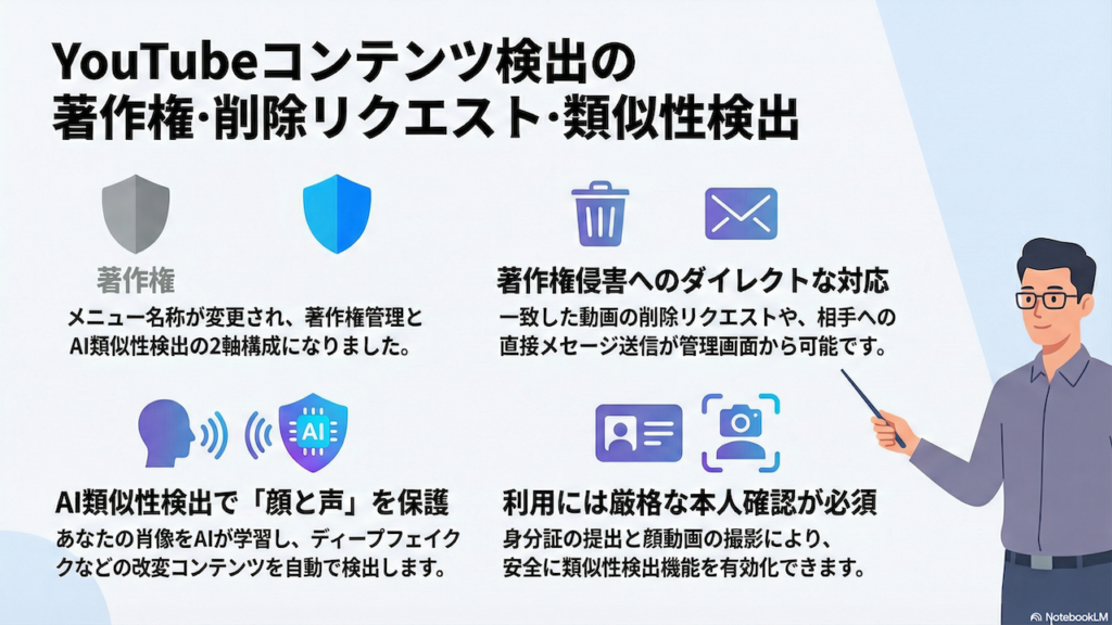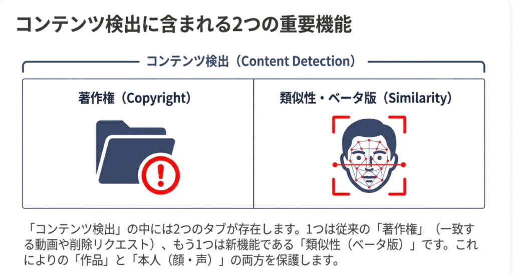 「著作権」という名称は、主に著作物の無断利用を検出・申し立てる機能を想起させるものだった。しかし2026年現在、YouTubeが取り組むコンテンツ保護の範囲はその枠を大きく超えている。AIによって生成・改変されたフェイク映像や音声まで含めた、より広義の「コンテンツ検出」を担うプラットフォームへと進化したことが、この名称変更に反映されている。