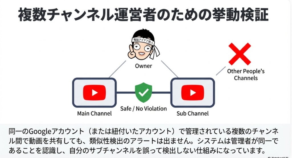 YouTubeでは1つのGoogleアカウントで複数のチャンネルを管理したり、アカウント切り替え機能を通じて異なるメールアドレスのチャンネルをまとめて運用したりすることができる。たとえばメインチャンネルとサブチャンネルを持つクリエイターが、同じ動画素材を複数のチャンネルで使用するケースは珍しくない。この状況で類似性検出が働いてしまうと、正当な利用に対して毎回アラートが上がってしまい、運用の妨げになる。