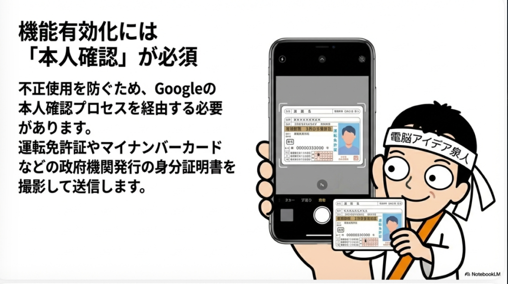 2. 厳格な本人確認プロセス 不正利用を防ぐため、以下の書類を用いたGoogleの本人確認が必須となります。