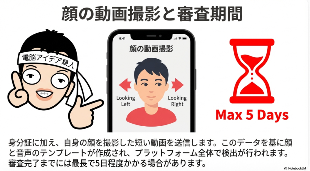 加えて、本人確認では書類の撮影だけでなく、顔を収めた短い動画の録画も求められる。これはYouTubeが顔と音声のテンプレートを生成するためのデータとして使用される。提供された画像と動画は類似性の検出に使われるほか、本人確認および安全確保の目的でも利用される旨が明記されている。プライバシーに関わる情報を提供することになるため、公式の手順に沿って慎重に進めることが求められる。なお、書類と動画を送信してから審査が完了するまでには最長で5日程度かかることがあり、完了後はメールで通知が届く。