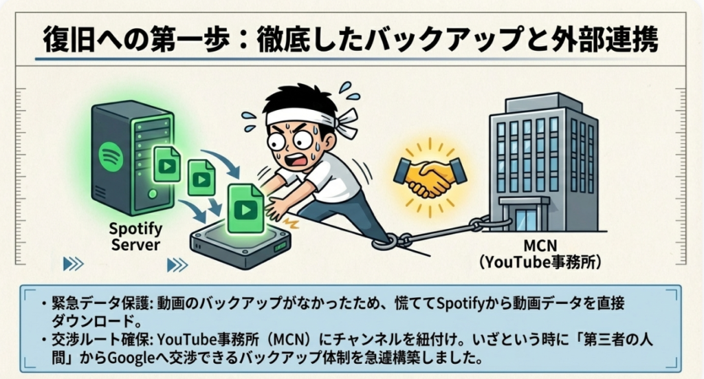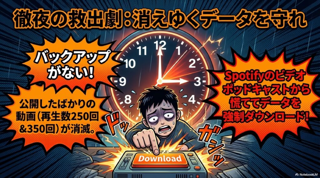 💾 バックアップ体制 動画や配信データを複数の場所に保存しておくことの重要性を示しています。今回は動画のバックアップを取っていなかったため、BAN中にSpotifyからビデオポッドキャストをダウンロードして対応しました。アカウント停止はいつ起きるか分からないため、日頃からデータの二重保存が不可欠です。