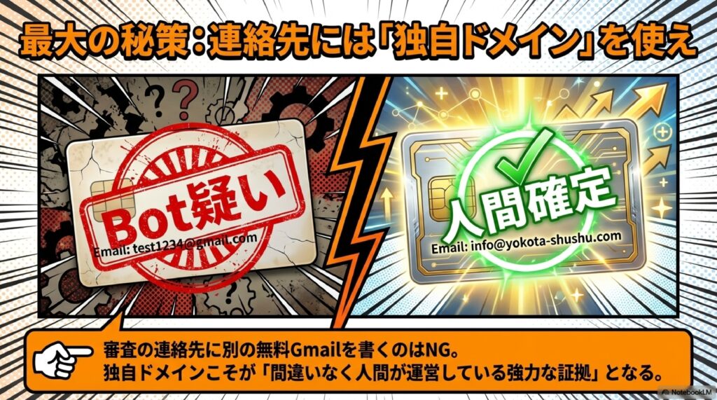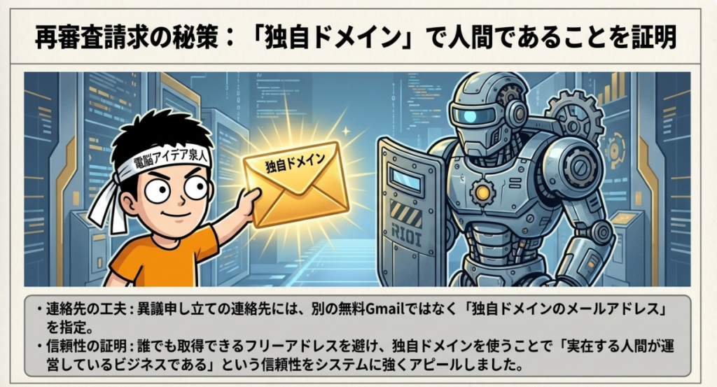 🌐 独自ドメインのメールアドレス Gmail等の無料メールではなく、自分で取得したドメイン(例:name@example.com)のメールアドレスのことです。再審査請求時に独自ドメインを連絡先にすると「人間が運営している」信頼性が高まります。また、Gmail以外のサービスでは独自ドメインでの登録がリスク分散に有効です。