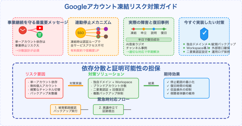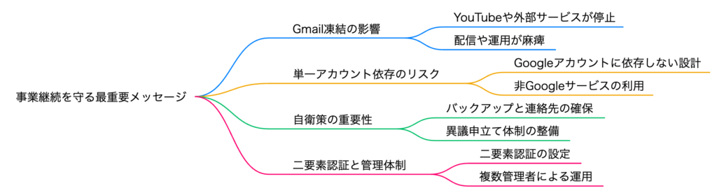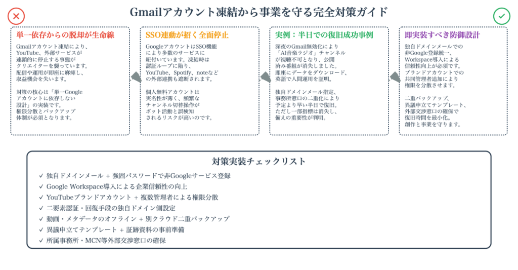 この経験から得た最大の教訓は、GmailアカウントがBANされると紐づいている全てのウェブサービスにログインできなくなるリスクがあるということです。YouTube以外のサービスには独自ドメインのメールアドレスでログインする、Gmailを使う場合はGoogle Workspaceなどの有料ビジネスアカウントを利用する、動画データのバックアップを常に取っておくといった対策が重要です。