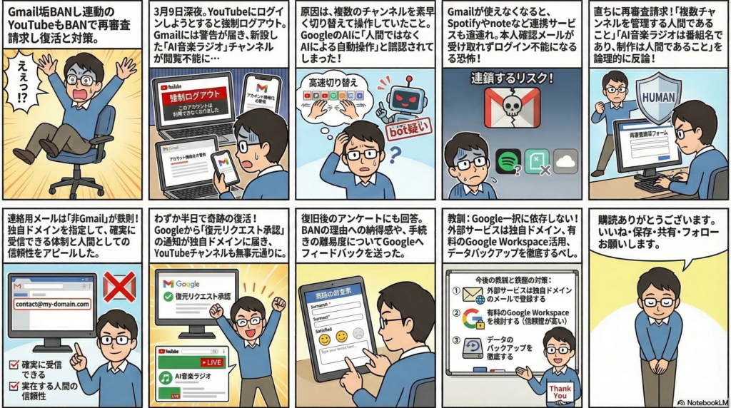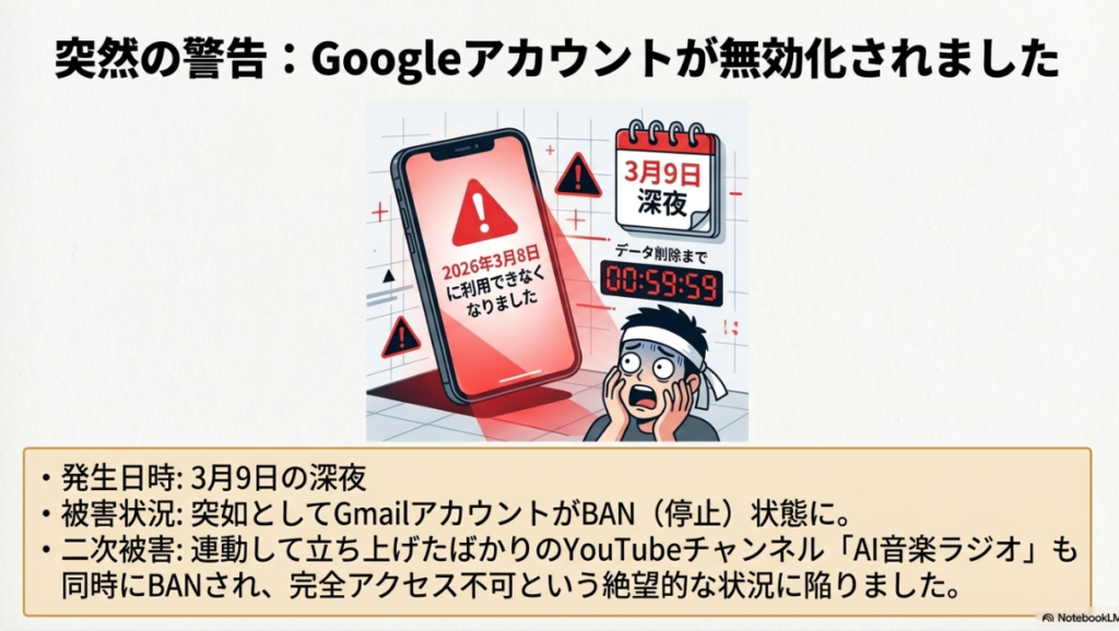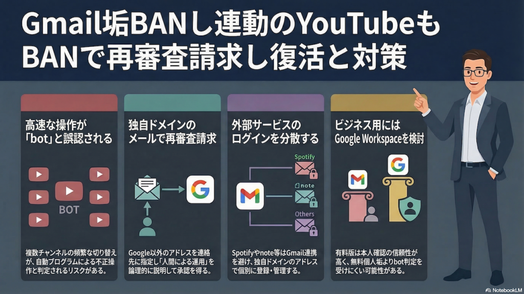 今回の記事では、GmailアカウントがGoogleによって突然BANされ、それに連動してYouTubeチャンネルまで停止されてしまった実体験をお伝えしました。原因は、複数のYouTubeチャンネルを頻繁に切り替えて操作していたことで、Googleのシステムに「AIのbotではないか」と疑われてしまったことでした。