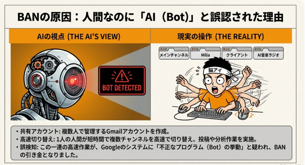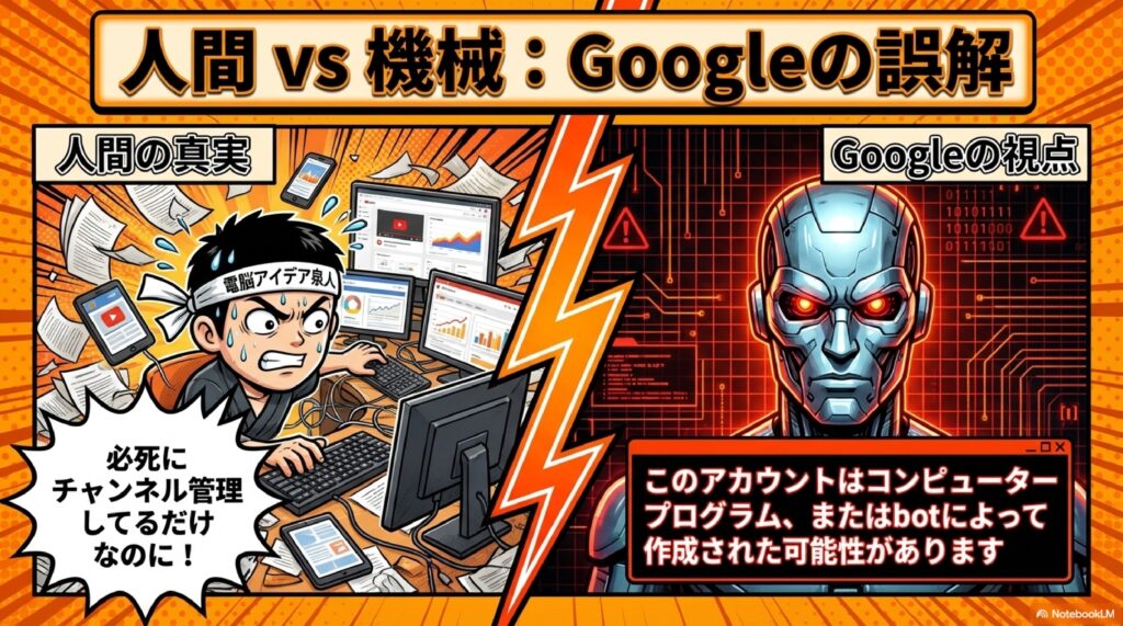🤖 bot誤認 人間の操作にもかかわらず、Googleの自動検知システムが「コンピュータープログラムやbotによる操作」と判断してしまうことです。複数アカウントの素早い切り替えやチャンネル間の頻繁な移動が、機械的な挙動と見なされる場合があり、今回のBAN原因もこれにあたります。