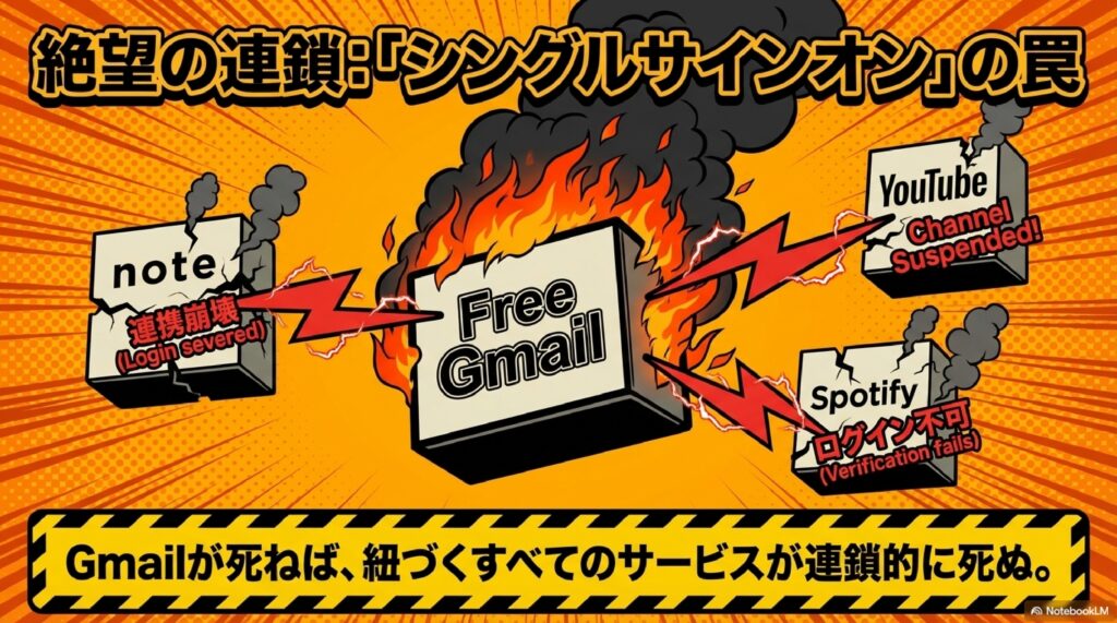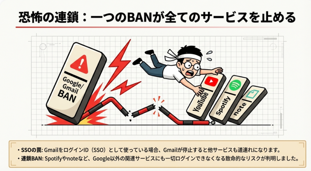 🔗 アカウント連動リスク 1つのGmailアカウントでYouTube・Spotify・noteなど複数サービスにログインしている場合、GmailがBANされると全サービスにログインできなくなる危険性のことです。認証時の本人確認メールも受け取れなくなるため、被害が連鎖的に拡大します。