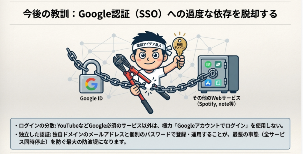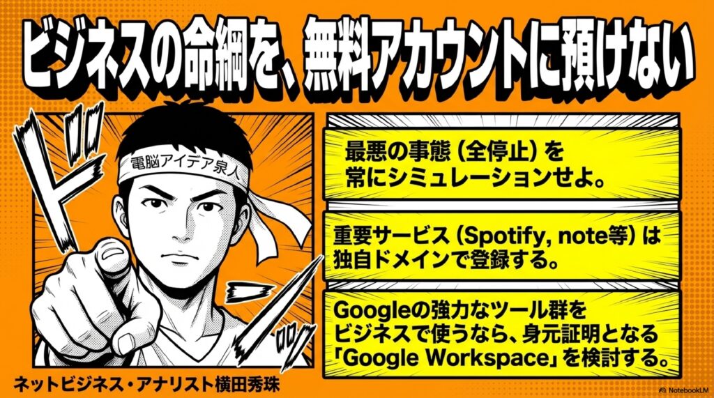 これやると全部止まりますから。それこそAIサービスも全部止まる可能性あるし、自分がやってるウェブサービスも全部止まる可能性があるっていうことを考えると、やっぱりちゃんと独自ドメインのメールアドレスを持ってやってくことの重要性ってのが分かるんじゃないかなと思います。