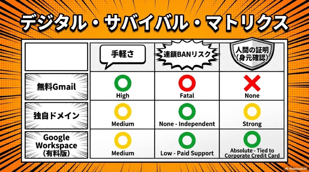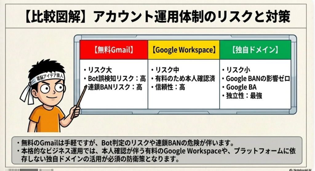 - YouTube・GoogleドライブなどGoogle系サービスはGmail必須 → Google Workspace(有料版)を使えば本人確認がしっかりしてBANされにくい