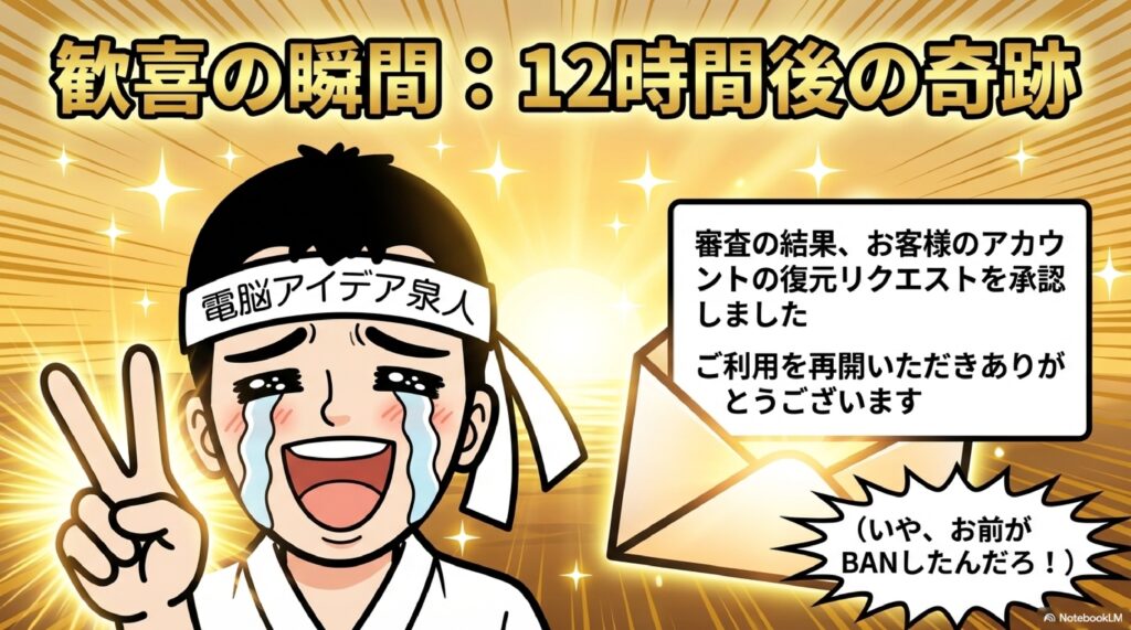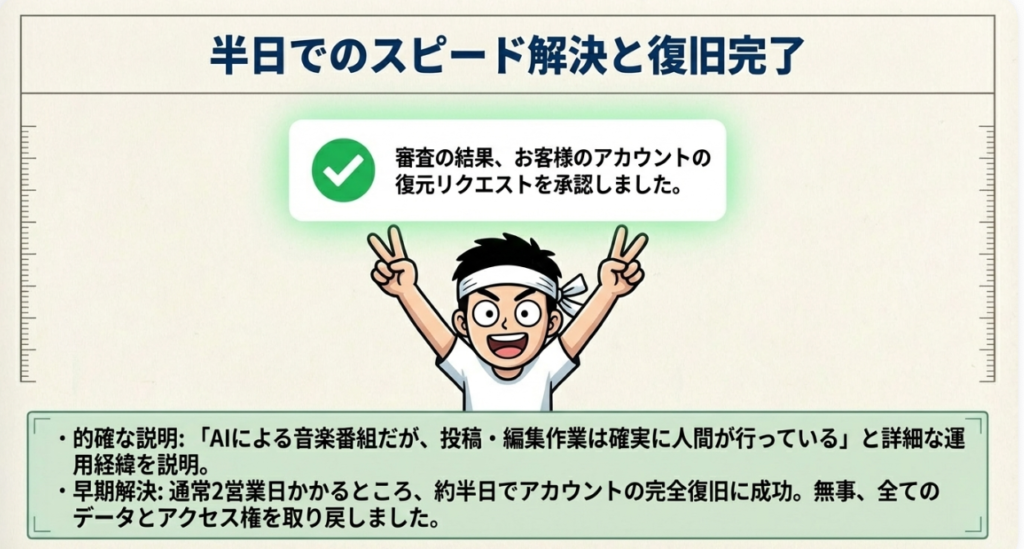 🔄 再審査請求(異議申し立て) アカウント停止が誤りだと考える場合に、Google側に復元を求める手続きのことです。停止理由への反論や正当性の説明を文章で送信します。通常2営業日かかるとされますが、今回は半日ほどで承認されました。テンパっていても冷静に状況を説明することが復旧への鍵となります。