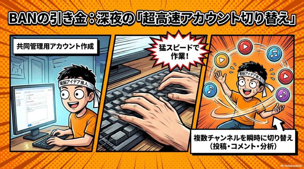 👥 共同アカウント運用 複数人でYouTubeチャンネルを管理するために、個人のGmailではなく共同用のアカウントを作成する運用方法です。YouTube自体にも管理者追加機能はありますが、今回はあえて共同アカウントを作成する方式を選択し、結果としてアカウント名が不自然になりBANの一因となりました。