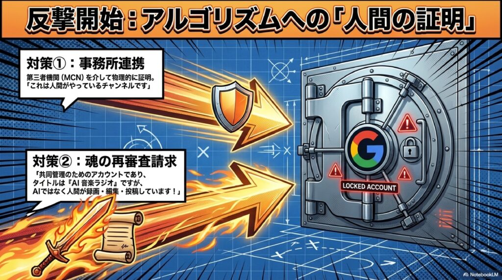 対策として、YouTubeで本格的に活動している場合は、YouTube事務所やMCN(マルチチャンネルネットワーク)にチャンネルを登録しておくことが有効です。事務所を通じてYouTube側に直接交渉できるルートが確保されるため、誤BANの際にも第三者が「このチャンネルは人間が運営している」と証言してくれる可能性があります。収益化時にマージンが発生するデメリットはありますが、アカウント保護という観点では大きな保険となるでしょう。