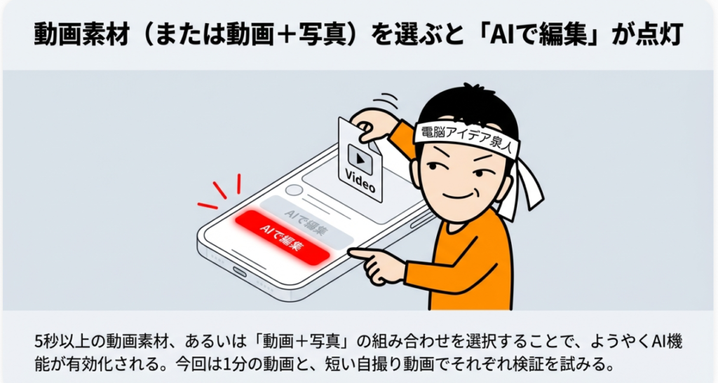 A2. 現時点(2026年2月時点)では、写真のみを選択した状態で「AIで編集」を使おうとすると、「クリップの長さは5秒以上にする必要があります」というエラーが表示され、利用できません。ただし、写真と動画を組み合わせて選択すれば「AIで編集」を利用することが可能です。今後のアップデートで写真のみにも対応する可能性は十分にあります。