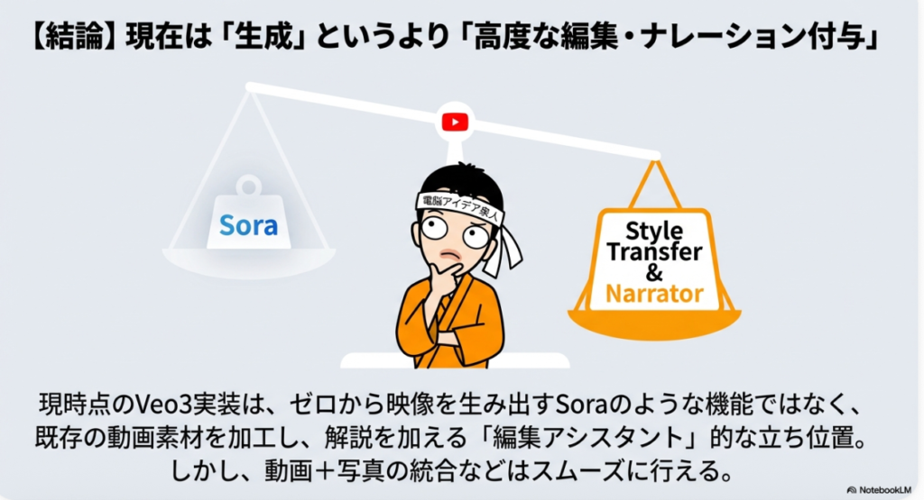 A5. OpenAIのSoraはテキストプロンプトから動画をゼロから生成する機能が中心ですが、YouTubeショートのVeo 3はあくまで既存の動画や画像を素材として取り込み、AIによるナレーション追加やスタイル適用を行うことに主眼が置かれています。ただし、今後はプロンプト入力による映像生成機能が追加される可能性もあり、将来的にはSoraに近い使い方ができるようになるかもしれません。YouTubeのプラットフォーム内で完結できるという点が大きな強みです。