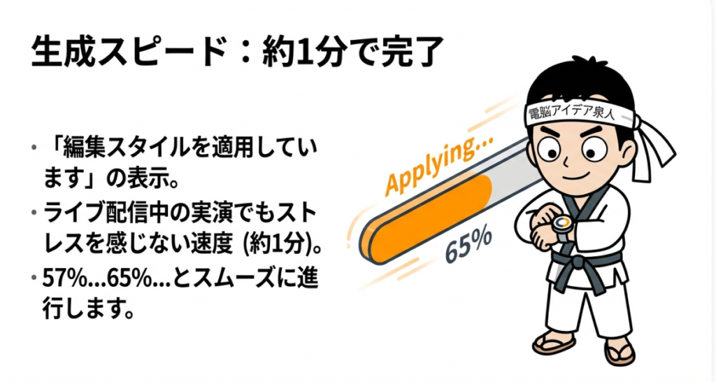 5. リアルタイム生成: 生成スピードは1分の動画に対して数十秒程度と高速ですが、内容が複雑な場合は「短尺動画での再試行」が推奨されます。