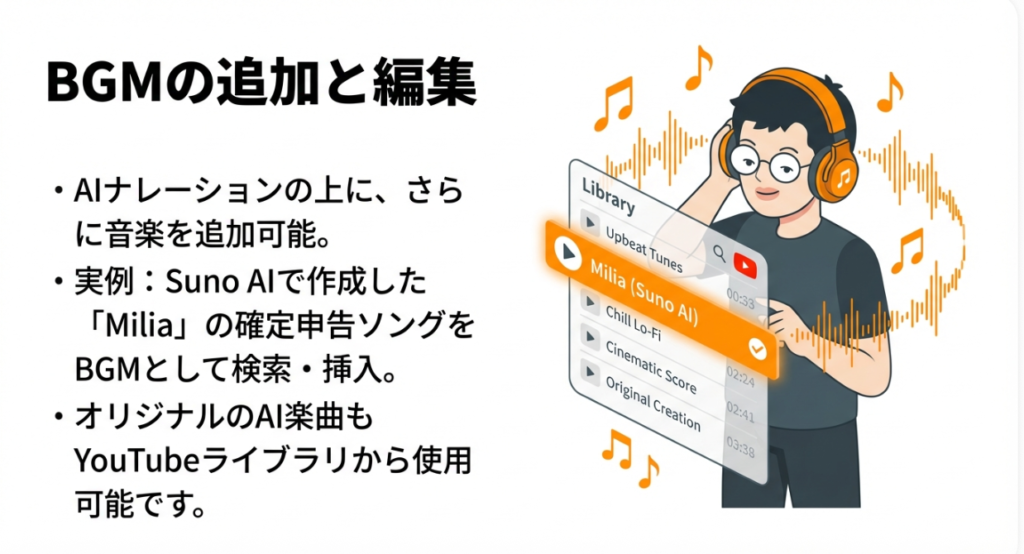 YouTube上の楽曲をBGMとして挿入可能。自作AI音楽なども利用OK