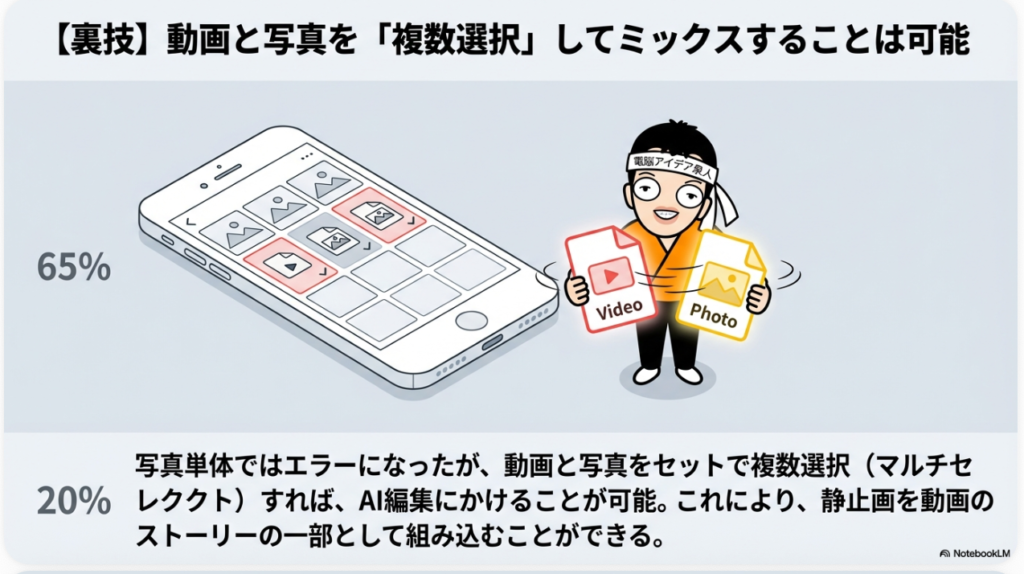 2. メディアの組み合わせ: ただし、動画と静止画を組み合わせた場合はAI編集が可能となります。静止画を動画の文脈に組み込むAIの挙動が鍵となります。