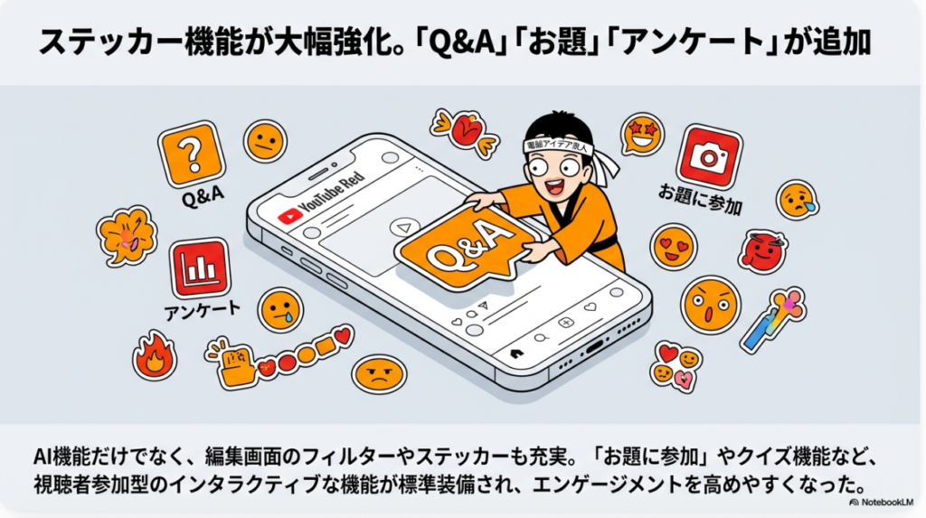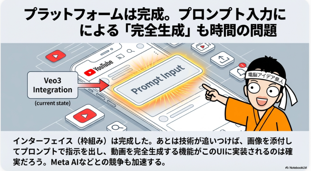 🚀 プラットフォームの進化 YouTubeがAI技術を積極的に統合し、動画制作のハードルを下げている動向を示す。インターフェースが確立されれば技術の進歩に合わせて機能が拡充され、画像からの動画生成やプロンプトによる加工指示など、Meta AIを含む各社との競争の中でさらなる進化が予想される。