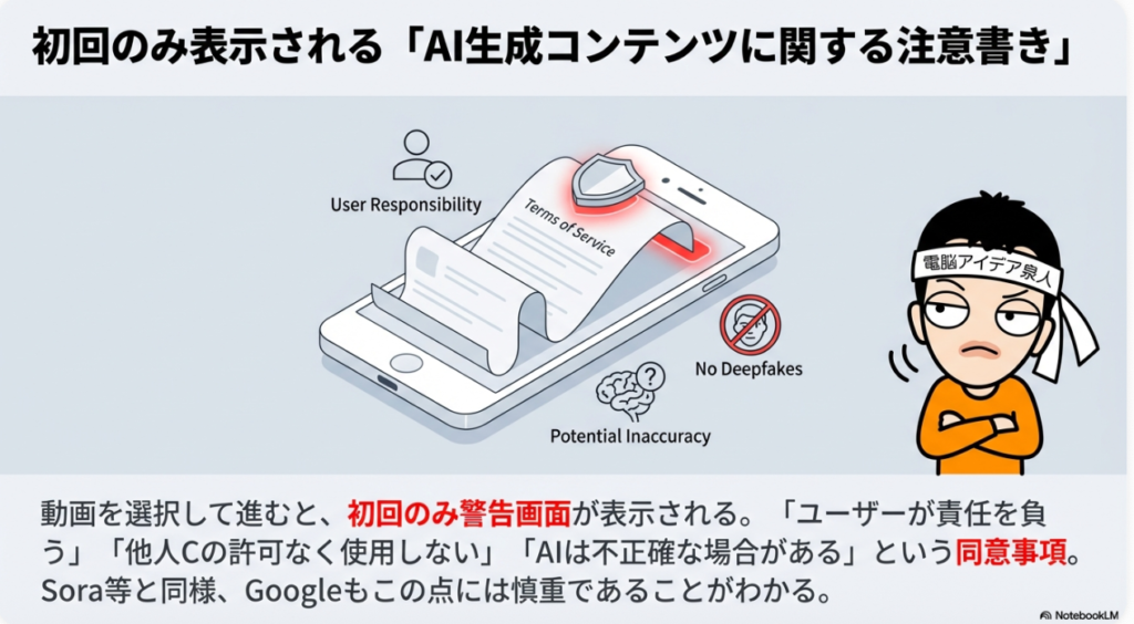 ⚠️ AI生成コンテンツの注意事項 初回利用時に1度だけ表示される同意画面。ユーザーが生成コンテンツに責任を負うこと、他人の素材を無断使用しないこと、AI生成物が不正確・不適切な場合がある旨が記載されている。Soraでも同様の画面があり、AI活用の責任範囲を明確にする仕組み。