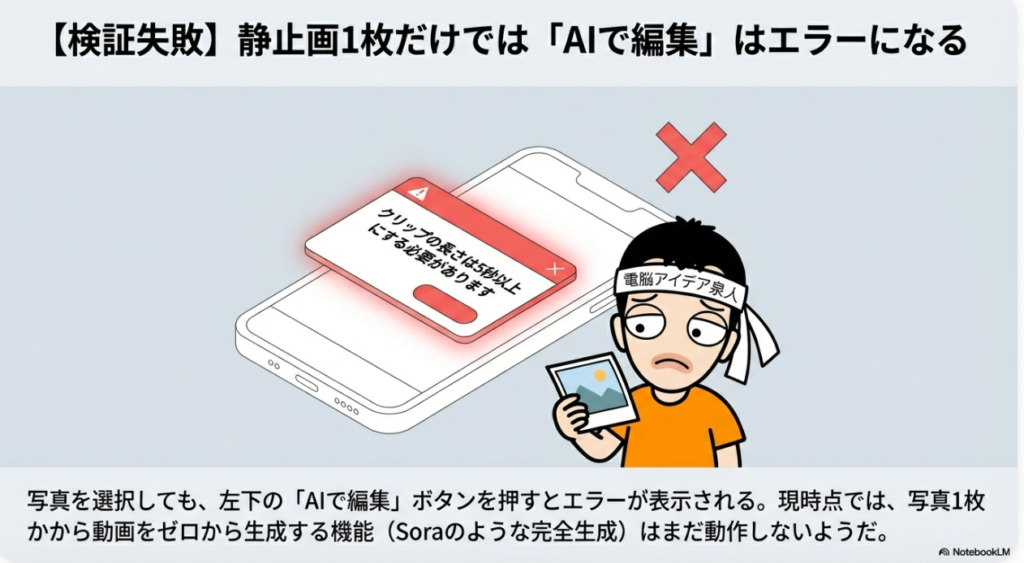 📸 画像添付 ショート動画作成時に、スマホ内の写真を素材として選択できる機能。現時点では写真単体でのAI編集はエラーとなるが、動画と組み合わせれば利用可能。将来的には画像単体からの動画生成にも対応すると予想されており、プロンプト入力での加工指示も期待される。