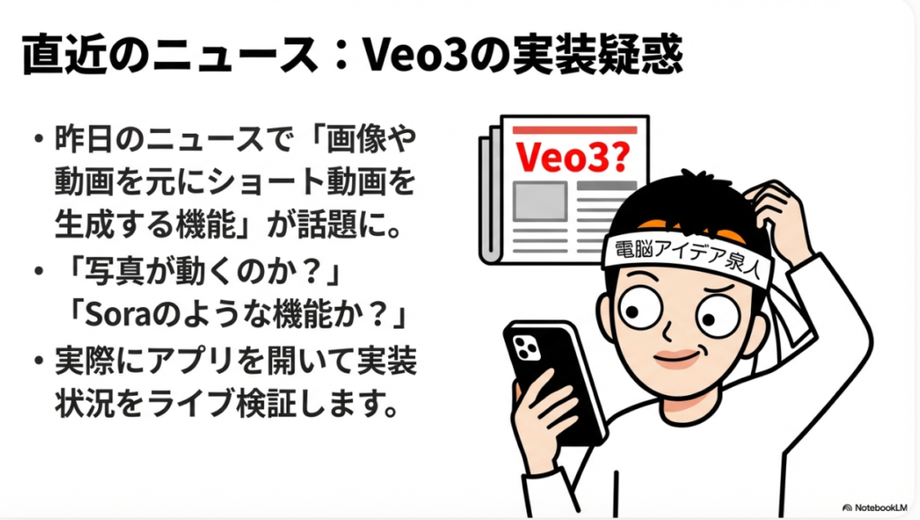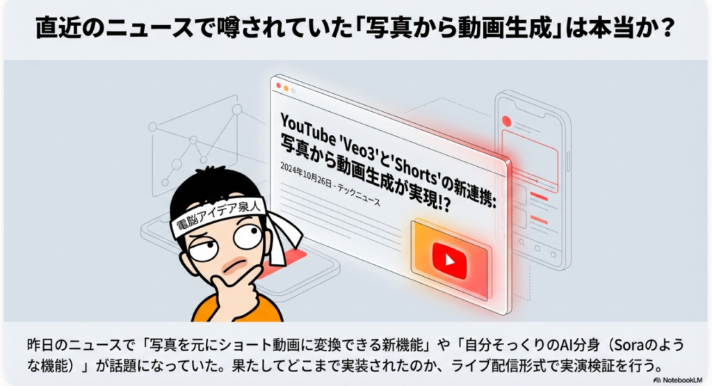 具体的に何が気になったかというと、「YouTubeショートに画像や動画を添付して、動画生成AIのVeo 3の技術で加工して投稿が可能になったんじゃないか」という点です。昨日のニュースの中には、「写真を貼り付けると、その貼り付けたものを元にショート動画に変換できるという新機能」が書かれていました。ここで「動画じゃなくて写真の?」と気になったんですよね。写真が動くの? という話だったわけです。
