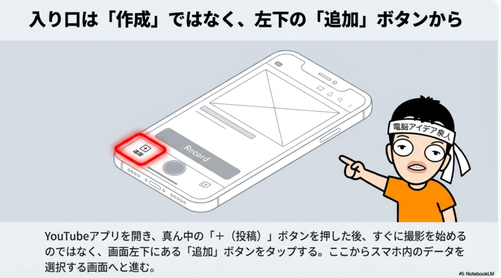 では早速、スマホの画面を出して、ショート動画の作成に行ってみたいと思います。まずYouTubeアプリを開きます。開いたら、画面の下のところにある投稿ボタン(真ん中のプラスマーク)を押します。普通であれば「投稿しますか?」という画面が出てくるわけなんですが、ここでいきなり動画を撮影するのではなく、画面の左下にある「追加ボタン」を押します。この追加ボタンを押すと、スマホの中にある写真や動画を選ぶ画面が出てきます。