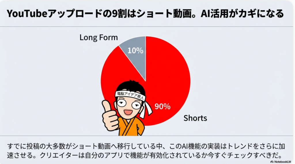 YouTubeでは、アップロードされるコンテンツの9割がショート動画になっているという話もあります。そこにAIの力が加わることで、ショート動画の投稿はさらに加速していくことが予想されます。ぜひ皆さんも、自分のスマホのYouTubeアプリで、この新機能が使えるようになっているかどうかチェックしてみてください。