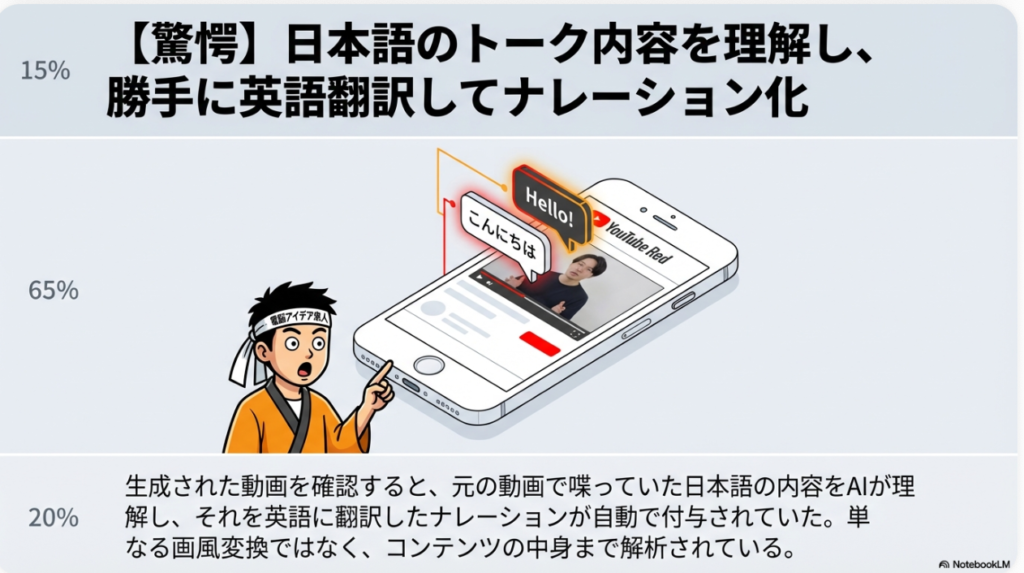 今回の実験で間違いなく言えるのは、Veo 3の技術がYouTubeの中に組み込まれたということです。AIが自分の声をしっかり英語に翻訳し、ナレーションも複数のスタイルから選べるようになっています。今はまだ機能が限定的ですが、だんだんといろんな機能が追加されていくことは間違いないでしょう。
