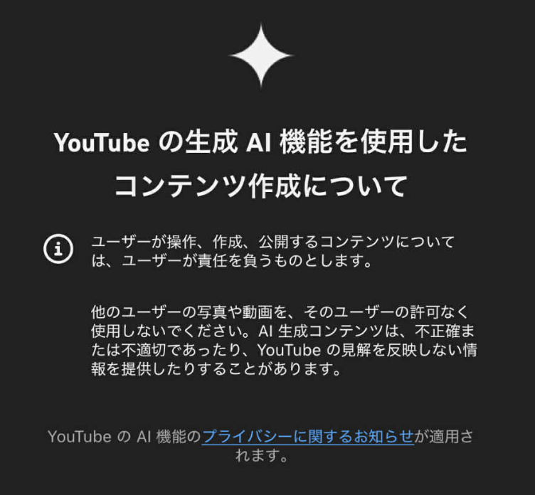 「AIで編集」ボタンを押してみると、こんな画面が出てきました。ここには「YouTubeの生成AI機能を使用したコンテンツ作成について」という見出しで、以下のような内容が書かれています。